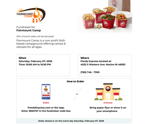 - February 7 & 15 - Fundraisers for Fairmount Camp - go to Panda Express on Feb. 7 and/or Texas Roadhouse on Feb. 15, tell them you are supporting Fairmount Camp (see below) and a portion of your purchase will go to the camp!