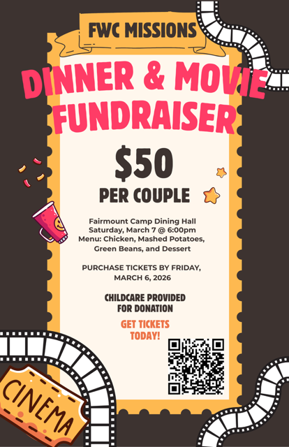 - March 7 - Missions Dinner & Movie Fundraiser - 6pm @ Fairmount Camp Dining Hall, $50/couple. Childcare provided for a donation. Purchase tickets here. See flyer below